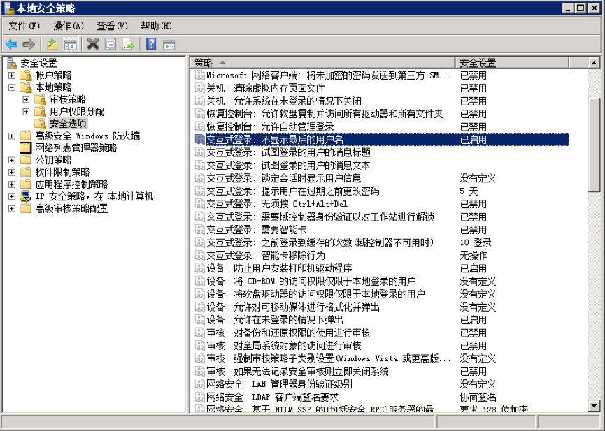 打开 控制面板 > 管理工具 > 本地安全策略,在 本地策略 > 安全选项 中,进行如下设置: