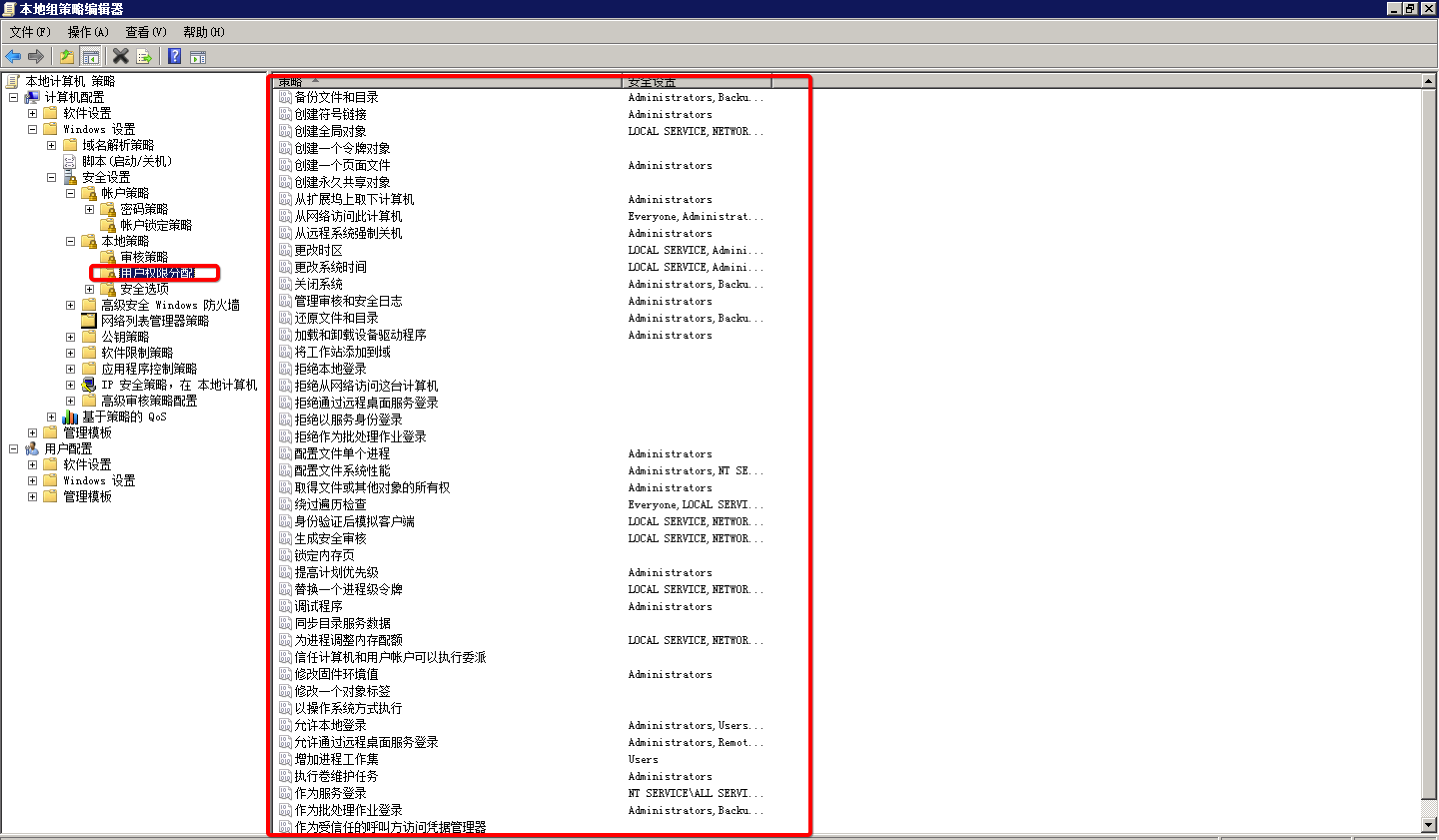 在本地安全设置中,从远端系统强制关机权限只分配给 Administrators 组。