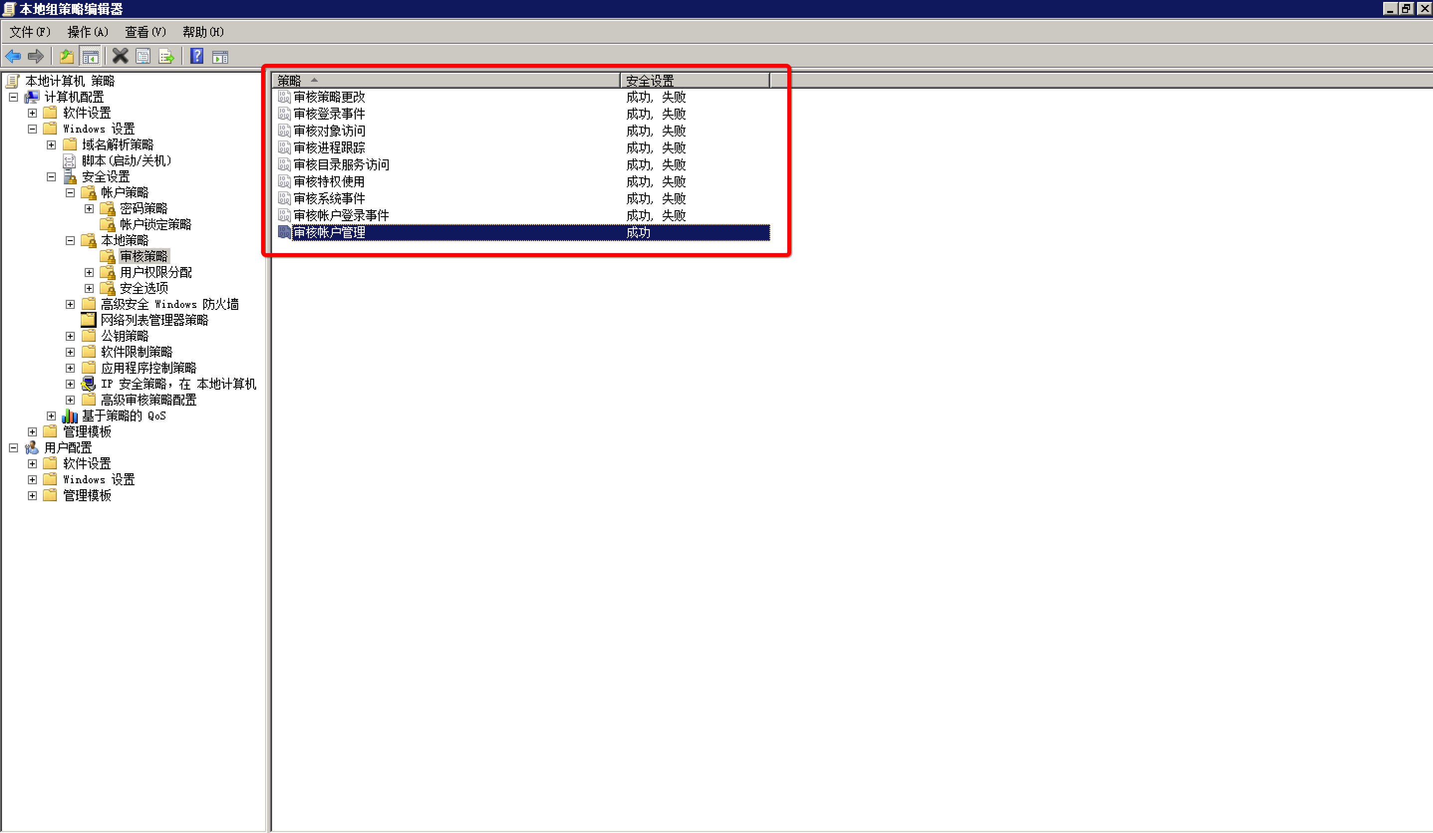 启用本地安全策略中对 Windows 系统的审核帐户管理,成功和失败操作都要审核。