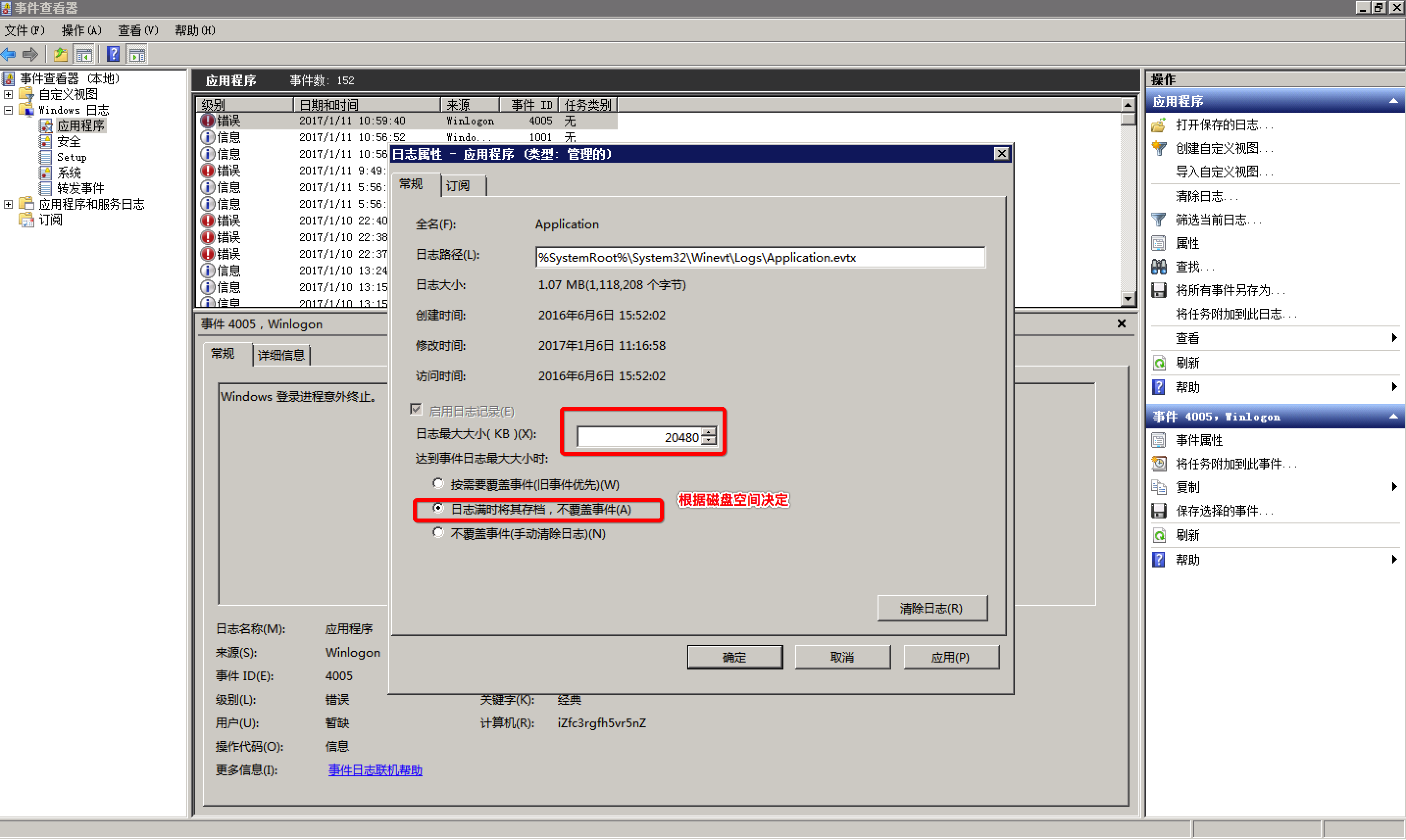 打开 控制面板 > 管理工具 > 事件查看器,配置应用日志、系统日志、安全日志属性中的日志大小,以及设置当达到最大的日志尺寸时的相应策略。