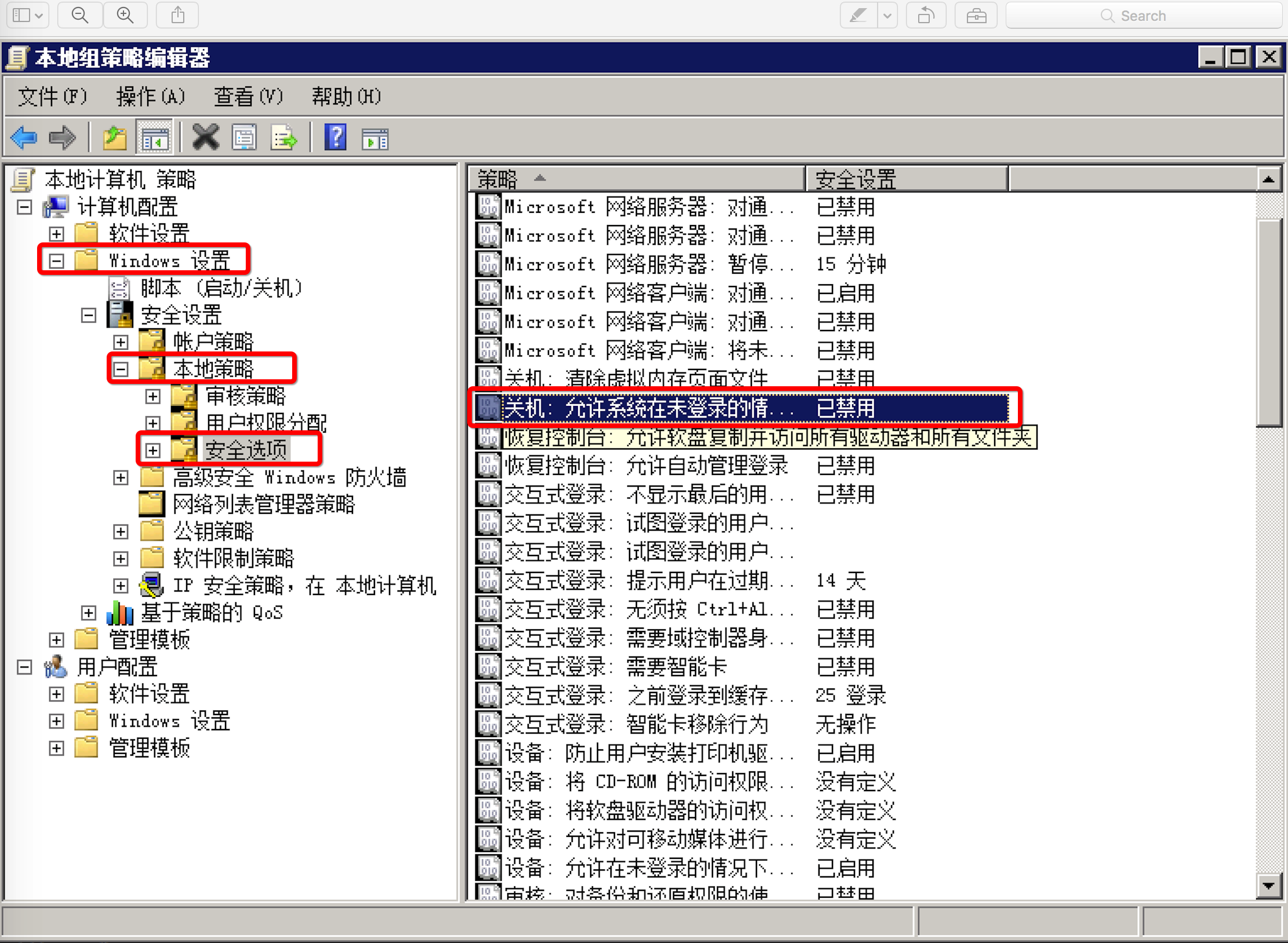 服务器默认是禁止在未登录系统前关机的。如果启用此设置,服务器安全性将会大大降低,给远程连接的黑客造成可乘之机,强烈建议禁用未登录前关机功能。